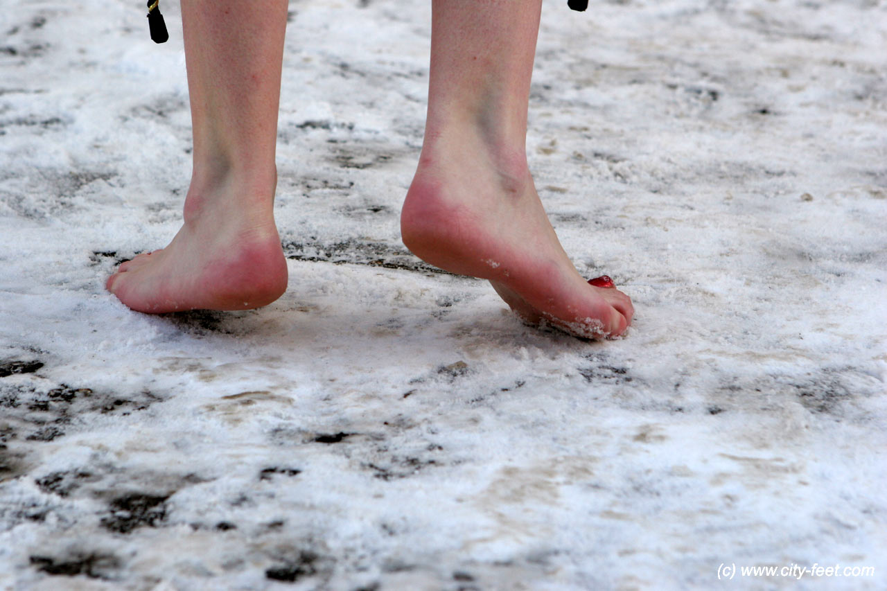 This set is a pretty example of snow foot show. The girls stopped on a plane snowy surface to show their frozen feet to the camera. The photographer made excellent close-up shots of the girls' heels, red with cold and their pretty frozen toes. Their light-red toenail seemed the same colour as their cold toes.