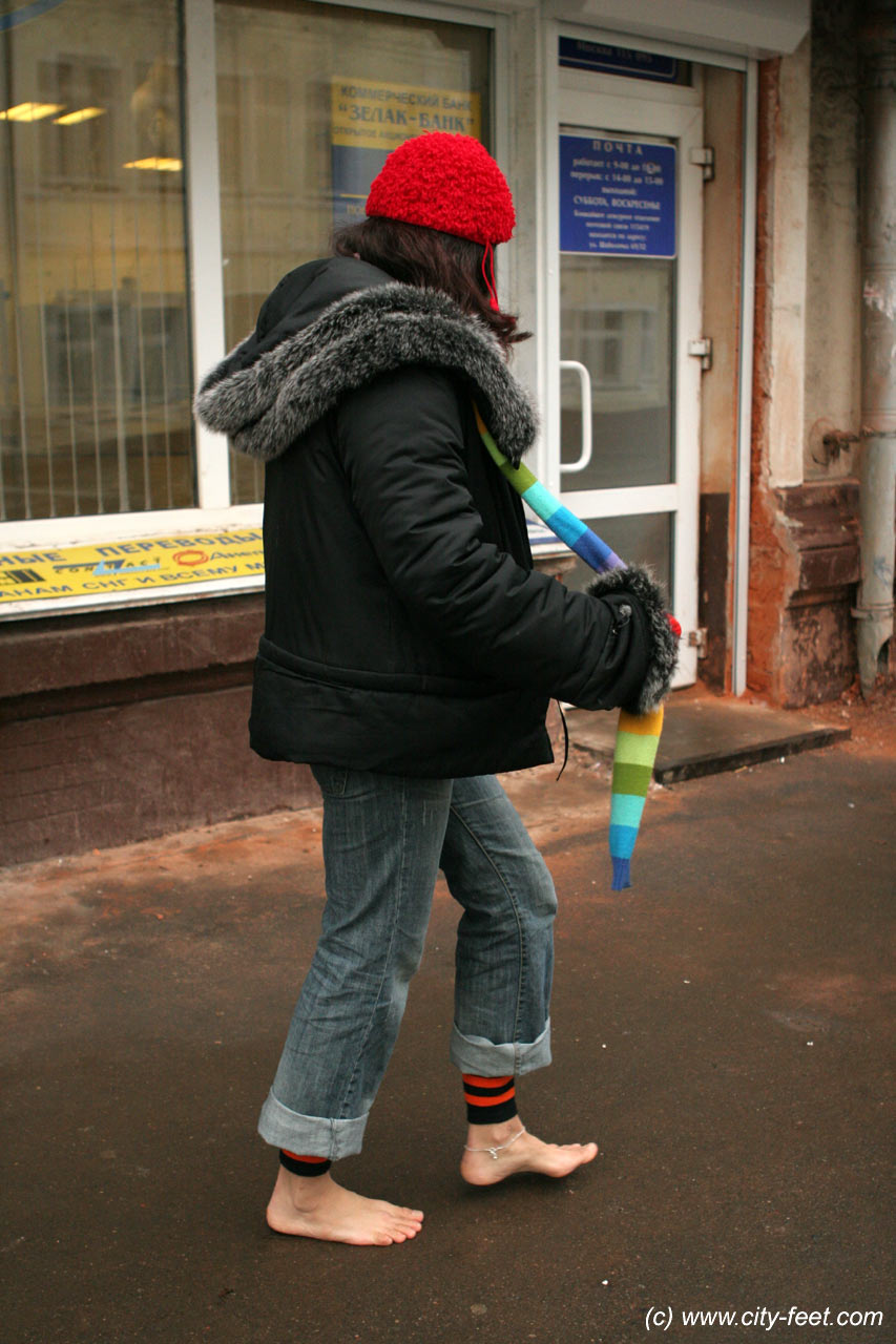 Ella is a very strong and experienced girl. So our proposal to test her endurance and to walk without shoes on such a muddy weather, wasn't a shock for her. She left the flat without boots and went along the street. Have a look at Ella's soles, covered with slush