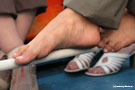 This pretty barefoot lady is having a ship trip over the Moscow river. Her feet are dirty and black and she is posing and showing them with pleasure to the ship passengers. A great amount of the close-ups as well, as other photos will make you take your breath.